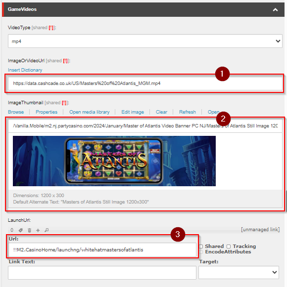Upon opening the appropriate Video Banner for each state, scroll down to the GameVideo section. See table below to update the appropriate fields.