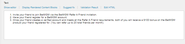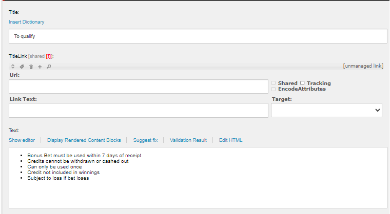 Contains the Terms and Condition section. To edit the contents go to Content > PromoDetails > DefaultFullTermsAndConditions.