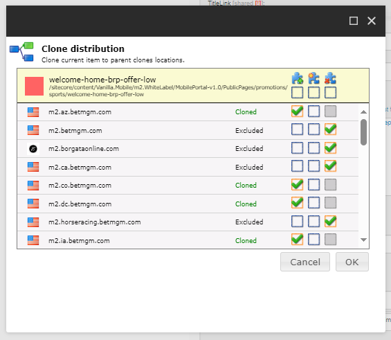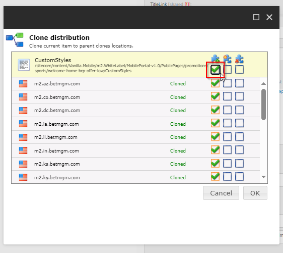 3. Go through each published subcomponent and when opening the Clone Distribution panel we can just click the Clone All checkbox as it will select all locations we have set to the parent when we have clones it. Then click OK.