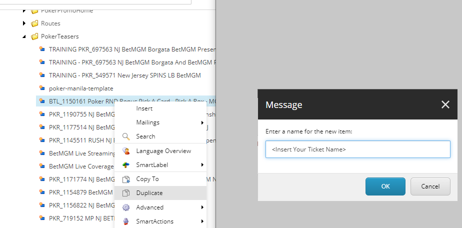 Right-click your desired carousel object, choose duplicate, then rename with your Ticket Name