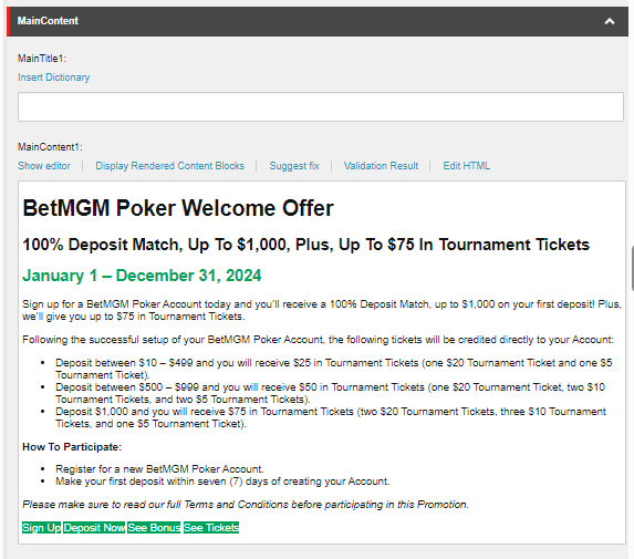 If Casino has MPP, Poker has Tournament Page or Tourney Page. Compare to MPP, Tournament Page requires many components in the copy such as PROMO HUB KEY TERMS, Poker Tile, PROMO LANDING PAGE, and Terms & Conditions.