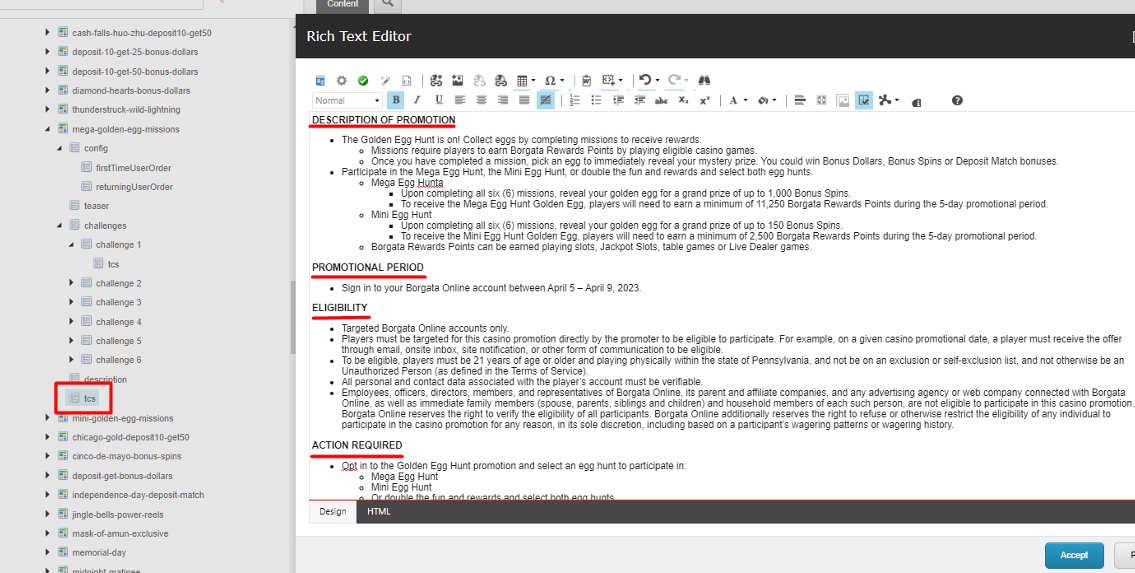 Format the TnCs as with the Casino Landing Pages, Titles are ALL CAPS with no colon(:).